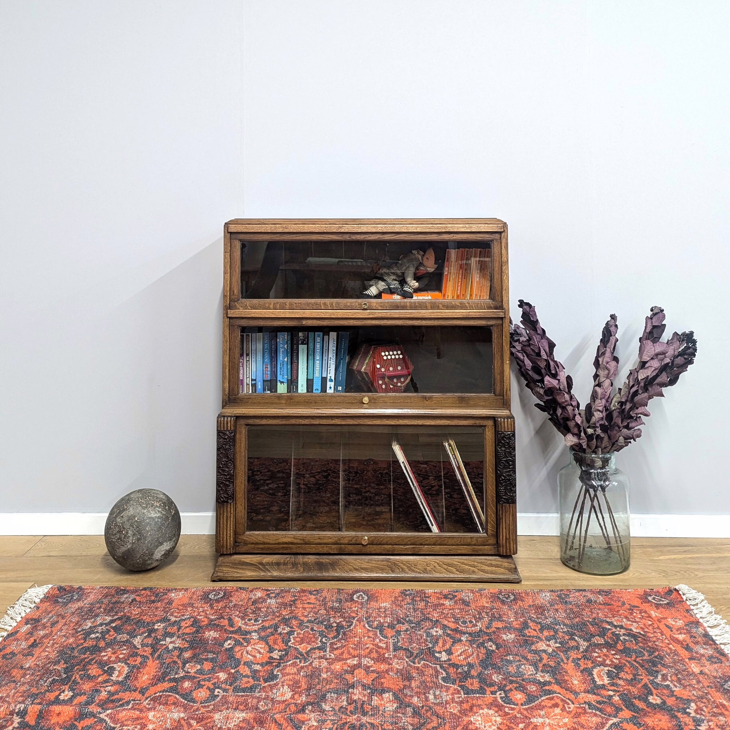 This smart, vintage barristers’ bookcase has had us scratching our heads a little. It’s obviously very similar to a Globe Wernicke and even has the same patented mechanism to lift and fold back the glass doors but we know that Wernicke bookcases are most commonly stacking. Furthermore, we can find no other like this documented so can’t definitively attribute to GW. It’s an antique enigma! No matter though, this is a well-crafted piece regardless, a single unit comprised of three graduated shelves, each featuring the lift-up / slide-back glass door. It arrived with us in a sorry state and has undergone an impressive glow-up with new brass knobs, fixed mechanisms and the oak exterior surfaces stripped and restored. The lower shelf has fixed dividers in place and 12 inch vinyl slots nicely in here. We love the decorative grape vines on either side at the bottom, molded in Bakelite. An old-fashioned piece that will add instant vintage warmth to the home whichever room it goes in.