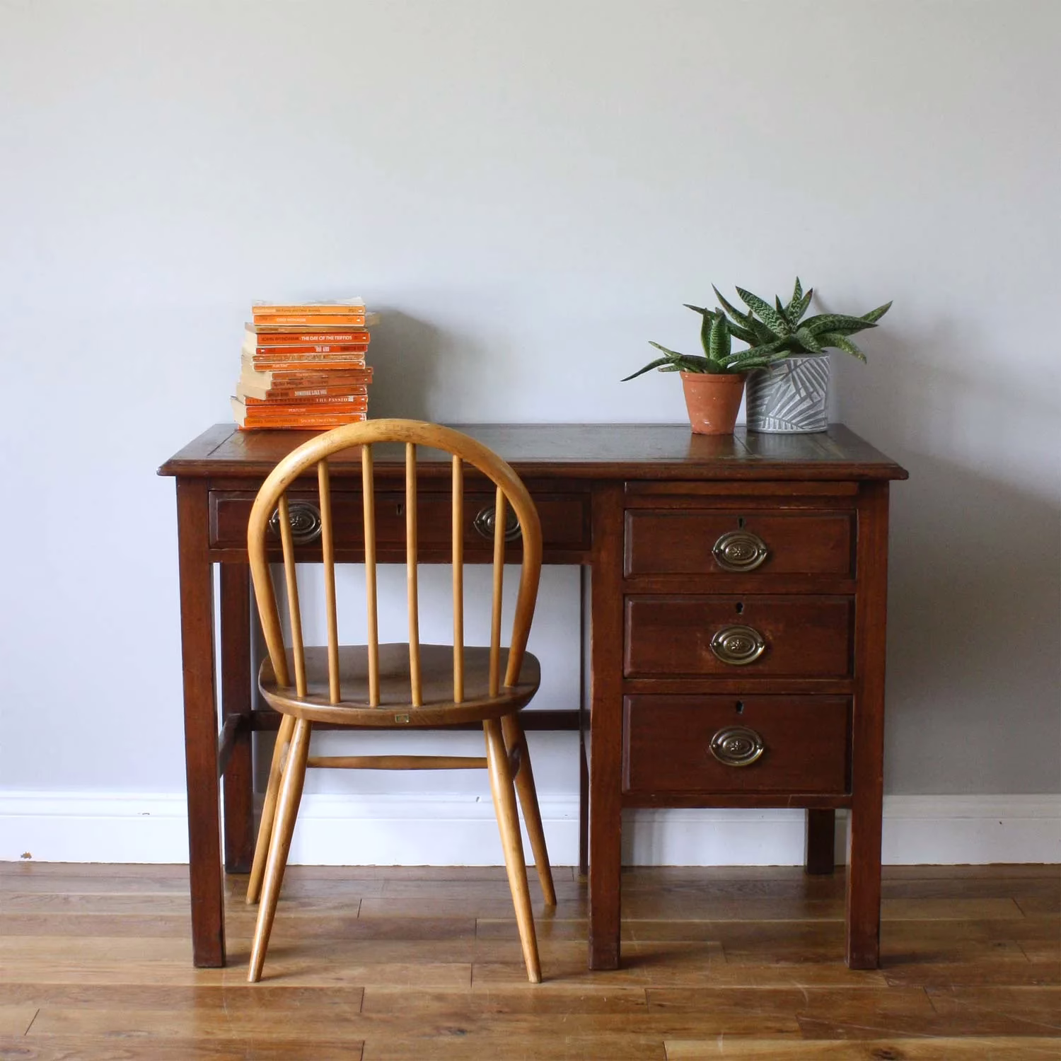At well over 100 years old, this antique desk, dating from the turn of the 20th century, carries life’s scars and knocks on its surfaces but it’s still going strong! It has particularly neat, tidy proportions so won’t take up huge space in a room but it also offers plentiful storage with three drawers. The inset green leather table top has a gold, embossed edge and has aged wonderfully in our eyes. This wear is very much part of its history and character. Solidly made, built to last, this has many years of active service left. It’s a real, old charmer.