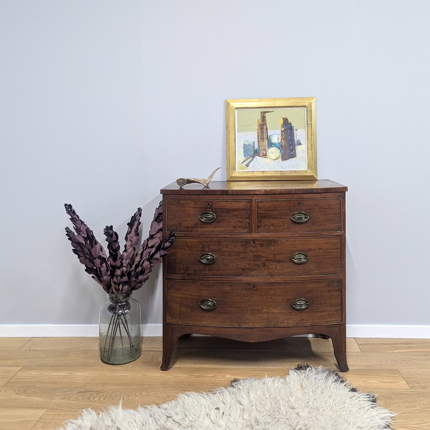 An elegant, bow-front, antique, late Georgian chest of drawers in beautiful, richly toned mahogany. We love the proportions of this piece – substantial but not too large. With four generous drawers, in a two over two configuration, there’s ample storage space here. The round, hanging brass handles are original and it sits on elegant, curved front feet. This is a very old piece that comes a little scarred and bruised – do browse through our photos for a good sense of this – but we love the minor imperfections of the antique timber and the history it holds. It’s very well-made, has already proved its longevity and is full of old-fashioned character.
