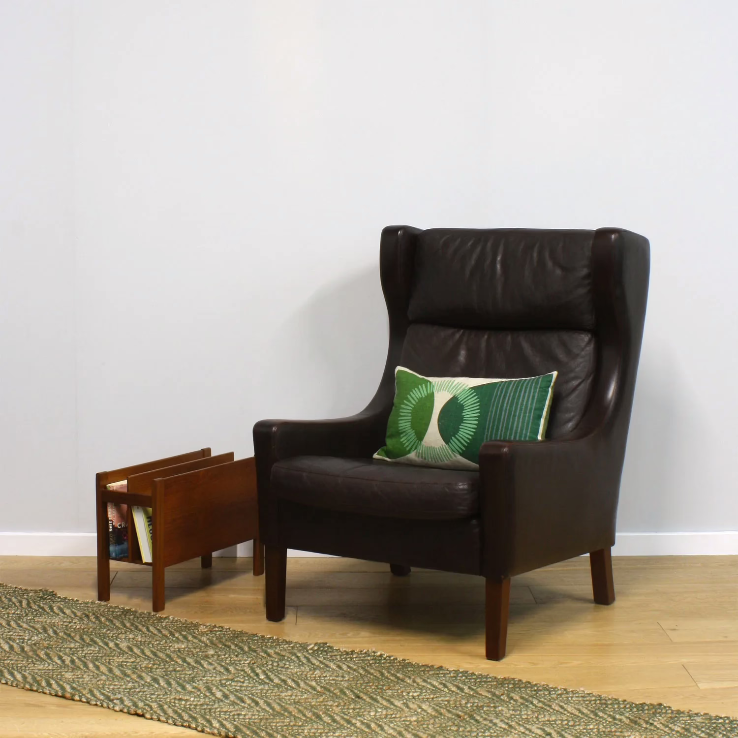 A stately, classic Danish winged armchair with a tall back and sharp, chiseled good looks. It’s a rather imposing, grand piece with generous proportions that surround you when you relax into it. The ideal chair for a study or snug, perfect for curling up in with a good book and a scotch. Equally, this will mix well with other seats in a mixed style lounge or family space. And of course, vintage chocolate brown leather is a practical option for what is destined to become someone’s favourite chair. It’s in fantastic order with plump cushions, supple leather upholstery and solid wood legs legs.