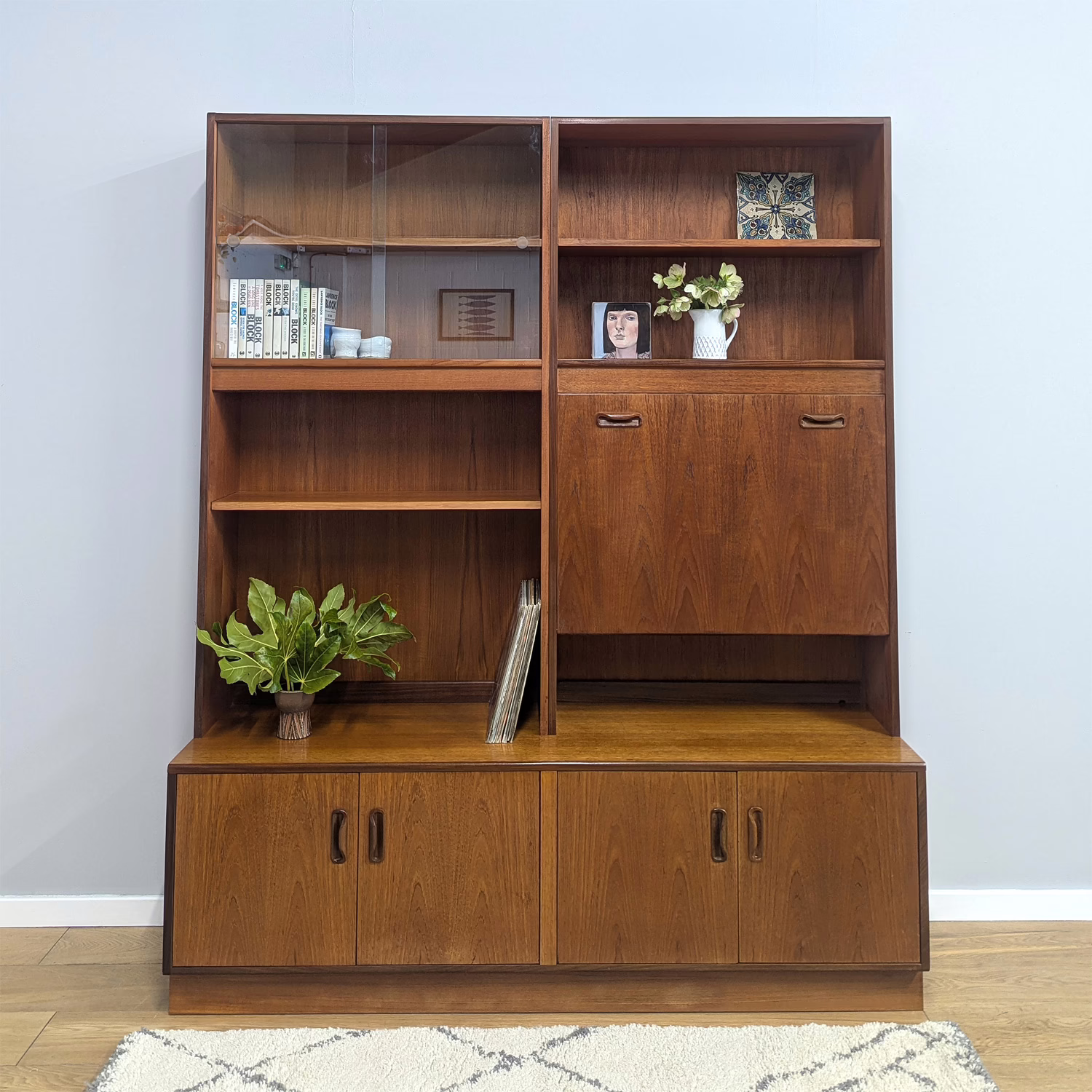Designed by VB Wilkins for G Plan, as part of his late sixties / seventies ‘Fresco’ range, this large, double width freestanding unit serves as storage and shelf space in one. Tall and wide but shallow in depth, it’s a multifunctional piece incorporating lower cupboards, a fall-door drinks cabinet, a glass-front bookcase along with open shelves. Indeed, you could create a stunning, statement feature wall with this piece. It’s comprised of three parts – two upper shelf sections which sit on top of the wide, low base unit. Furthermore, there are two hidden lights within the upper sections, one in the drinks cabinet and one that illuminates the open shelf. You can opt to plug these in or not as required. All electricals have been PAT tested for compliance of course. It comes in fantastic original condition and it’s a British midcentury classic.