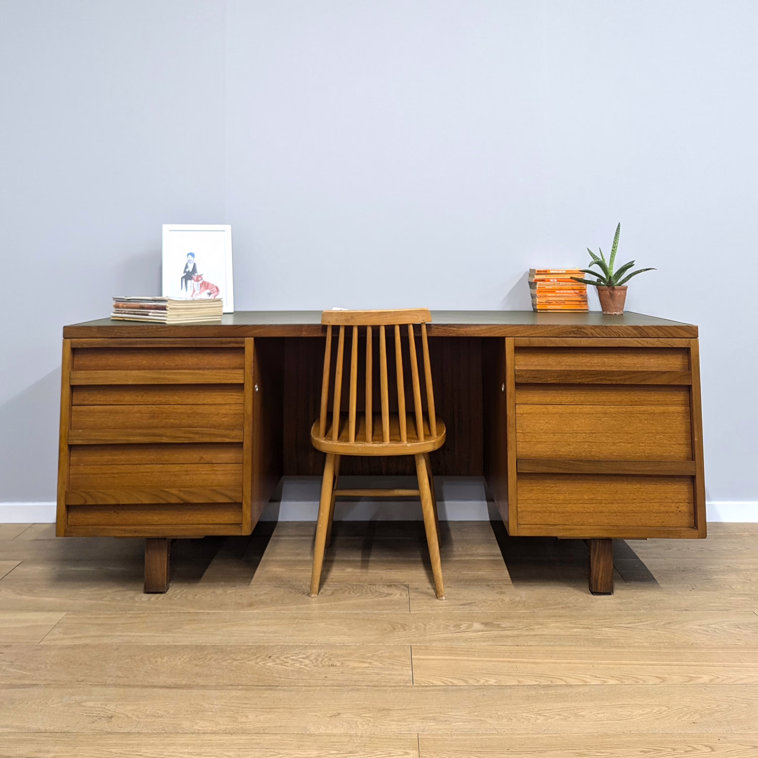 A seriously impressive and substantial vintage desk for someone that means business. Made by COF, Carson Office Furniture, it dates from the seventies and although practicality and function have clearly been put first, the design is immediately identifiable as mid century with an industrial, rather Brutalist feel. It comes with loads of office storage across its drawers but it’s the width of the desktop itself that is so impressive. It’s very long at over 1.8m so ideal for someone who needs to lay out plans or creative work with ample room to spread out. The original green leather desktop softens this desk, breaking up the expanse of teak and it makes for a comfortable work surface.