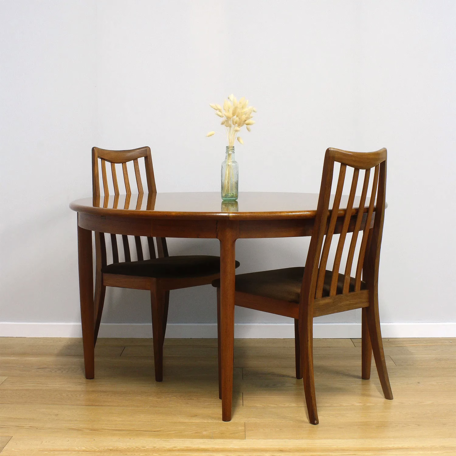 Elevate your dining room with this grand, extending table that has great provenance. Designed by Niels Otto Møller in the 1960s for JL Møller Møbelfabrik, this very fine, attributed piece arrived with us in rather sad condition. Although we knew it was something special, it was grubby and had a repair-gone-wrong on the table top. It went to off to our French polisher who wove his magic, finishing the table with high gloss lacquer and knocking back that poor damage to the veneer so that it’s now barely noticeable. It’s a stunning piece, showing that an every-day item of furniture like the humble dining table can be a thing of design beauty and history, as well as robust and functional. A perfect round in its regular mode, comfortably seating four. Pull the two sides apart to find the hidden folded extension in the the middle. This fans out and the side close for a seamless table top that can seat six – eight guests. The glossy table top finish makes the teak wood grain sing and we love the simplicity of the long, tapered solid teak legs.