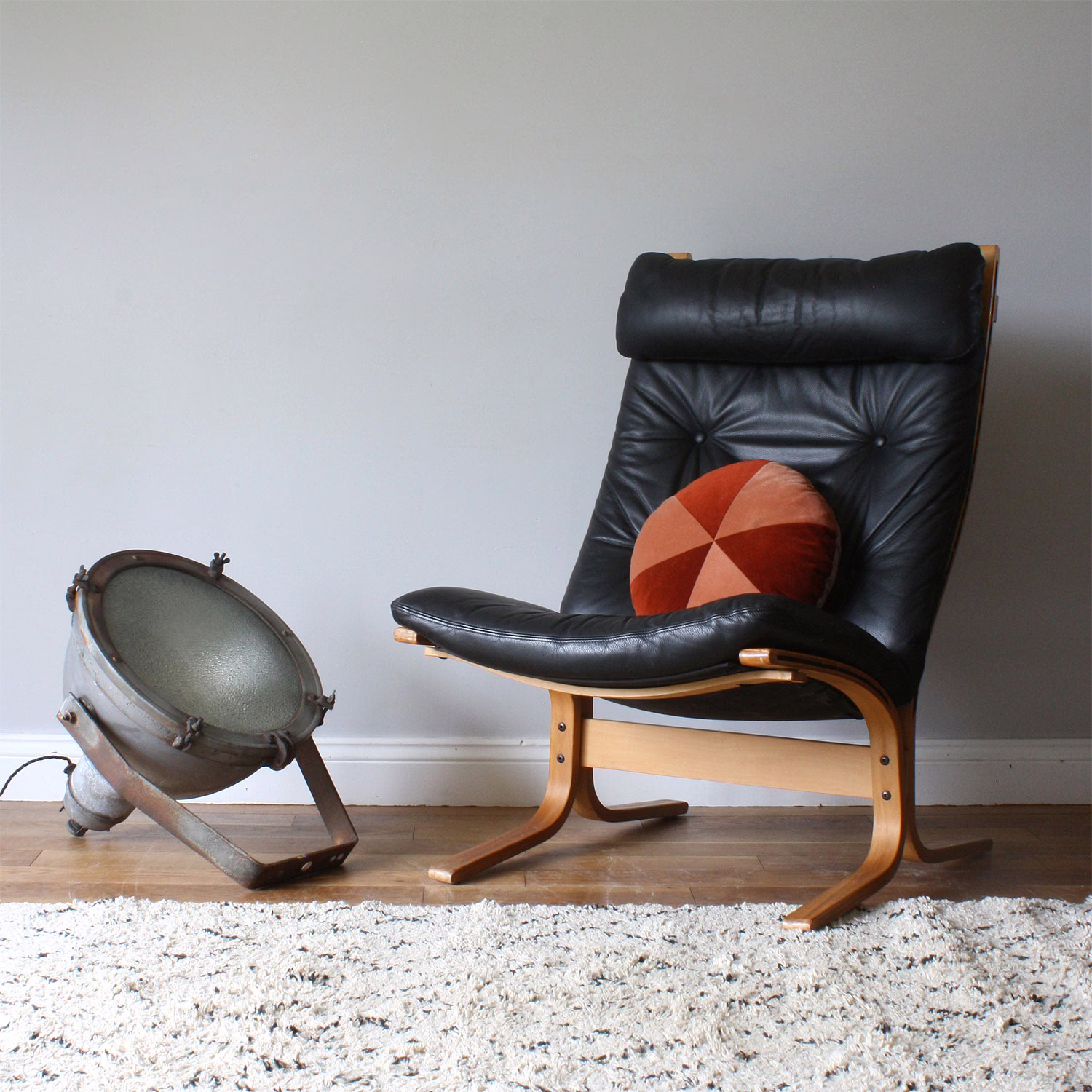 This chair is one classy number. Smart and stylish, it hails from Norway and dates to the 1970 (also the original design dates from the 1960s, this is a later model), made by Westnofa and designed by the renowned, Ingmar Relling. A tall version of his acclaimed, iconic ‘Siesta’ chair that won his design recognition and cemented his reputation as a leading MCM designer. Even the White House, back in the day, was furnished with Ingmar Relling’s Siestas! Its floating, curvaceous form combines striking good looks with super comfort, its tilt and suspension providing great support. We love the inky black leather of this one and the detail of the cord running through the frame and seat canvas. These chairs offer an excellent alternative to bulkier, more traditional lounge chairs as the proportions are compact and slim without compromising on comfort.