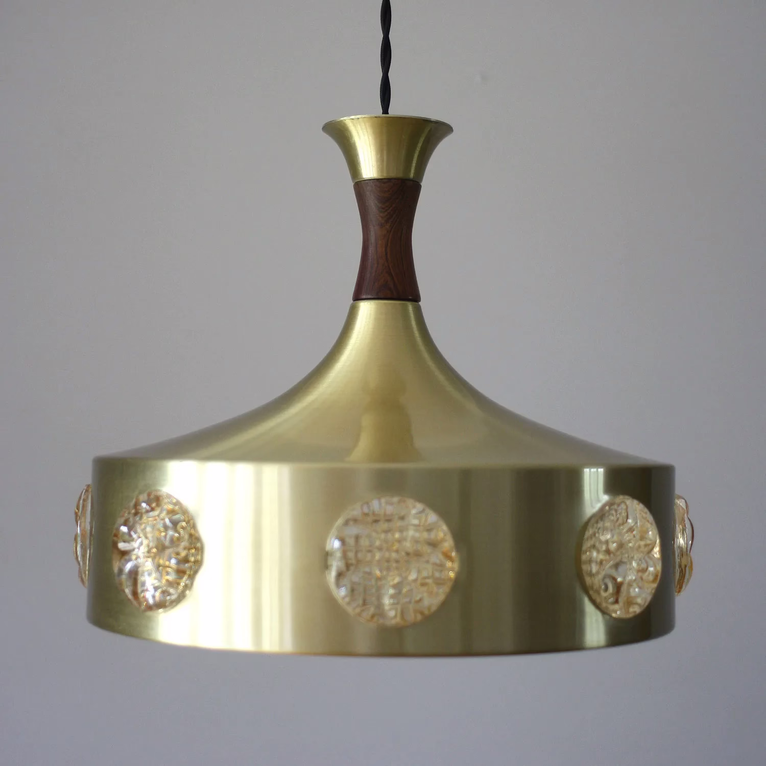 Unmistakably midcentury, this metal Danish pendant light shade has bags of vintage charm. Finished in a brushed gold, its wide rim is bejewelled with large, textured, glass rounds. We love too the teak inset in the neck, a thoughtful design detail. Switched on, the light radiates from below as well as through the glass. With its extra bling, this lampshade would look super hung low over a large dining table. A fine piece with history and character, restored for today’s interiors.