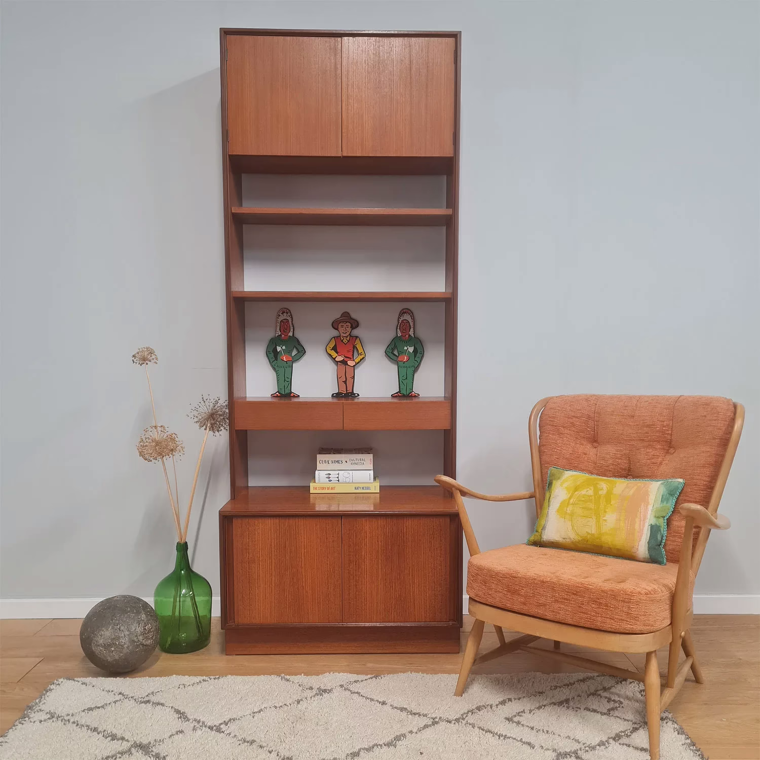 Freestanding shelf units, such as this handsome, late 1960s / early 1970s one, are versatile pieces as they negate the need for built-in shelves. Designed by R Bennett for G Plan, as part of his popular Form 5 range that launched in 1967, he took inspiration from his Scandinavian contemporaries. And you can see that here… clean lines, midcentury simplicity, form and function. Tall but shallow, this model features an upper cupboard, two adjustable shelves, two small drawers and a lower cupboard – combining lots of hidden storage with display surfaces. This unit would work well in the alcove by a chimney breast, and its unfussy, parred back design means it won’t compete with furniture from other genres or woods of different tones.