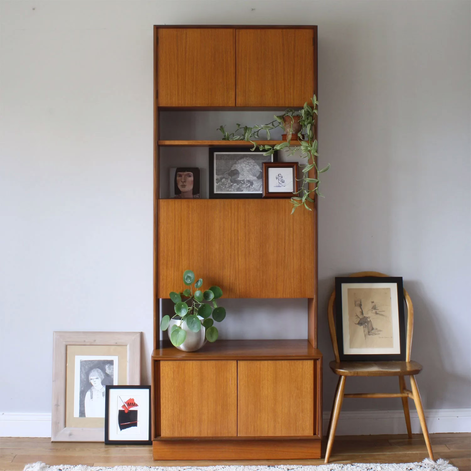 Freestanding shelf units, such as this handsome, late 1960s / early 1970s one, are versatile pieces as they negate the need for built-in shelves. Designed by R Bennett for G Plan, as part of his popular Form 5 range that launched in 1967, he took inspiration from his Scandinavian contemporaries. And you can see that here… clean lines, midcentury simplicity, form and function. Tall but shallow, this model features an upper cupboard, an adjustable shelf, a drinks cabinet and a lower cupboard – combining lots of hidden storage with display surfaces. This unit would work well in the alcove by a chimney breast, and its unfussy, parred back design means it won’t compete with furniture from other genres or woods of different tones.