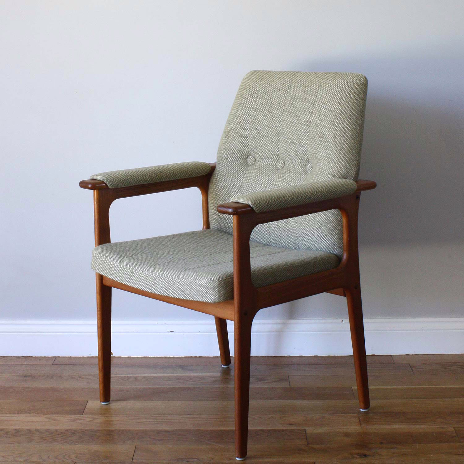 Although we’ve not been able to attribute this Danish light oak desk chair, there is no mistaking the fine quality of its construction and its elegant tall design. It’s particularly striking with thoughtful angles and curves. The upholstery is tweed wool weave of neutral oatmeals and light browns. The proportions are generous with a wide seat and tall seat height, so we think it was originally intended as a desk chair. Very comfortable and supportive, it’s a fine piece of late midcentury design in fantastic order.