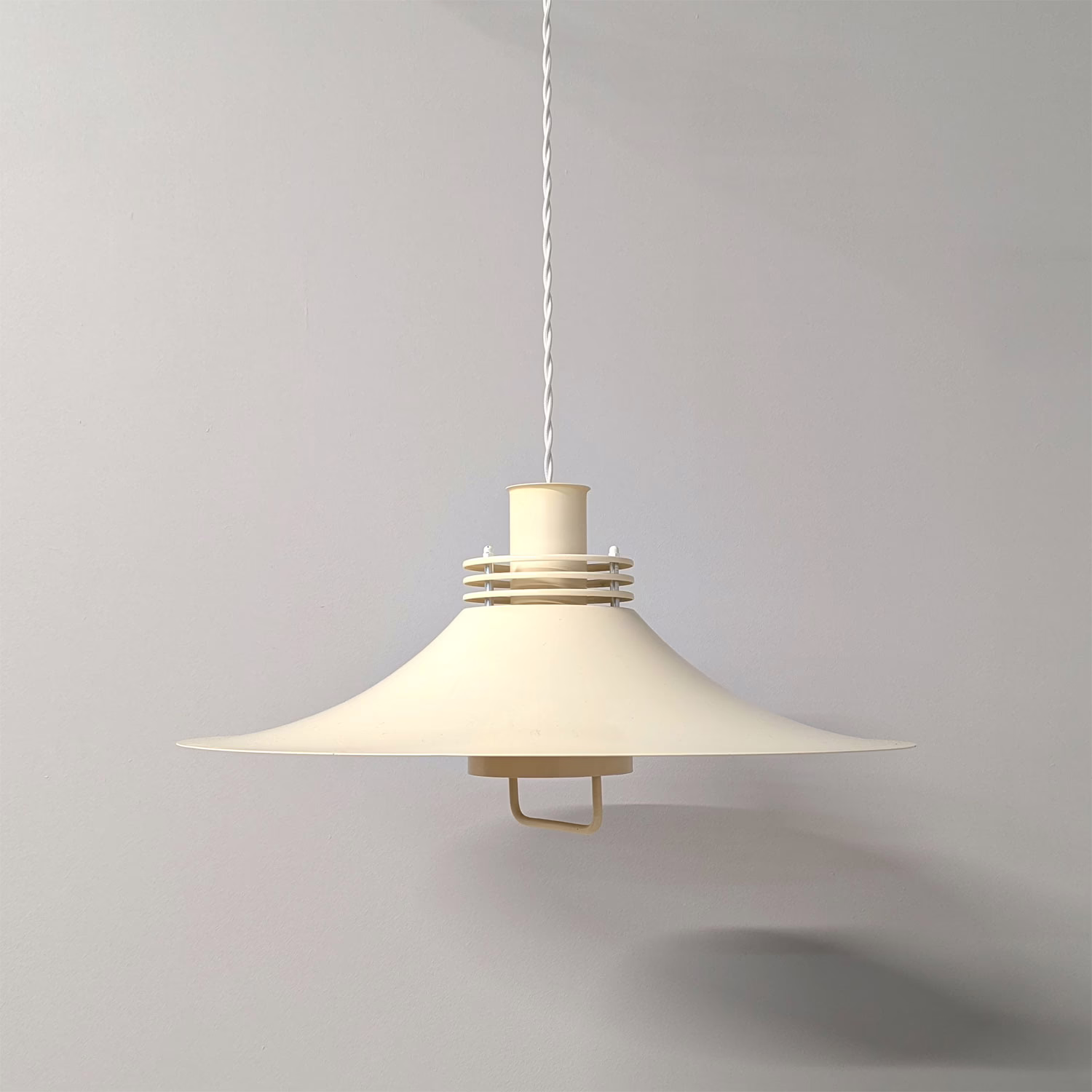 An impressive, large, vintage Scandinavian ceiling lampshade with a simple, elegant design. We love the triplet of rings above the main shade that glow upwards when on, creating a subtle note of distinction. Originally this would have been an extending shade (a very seventies trend!) that you could pull up or down over the table, hence the handle underneath but we love this as a feature and a nod to its past.