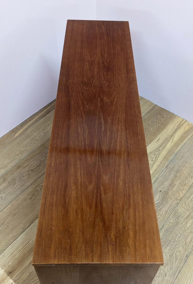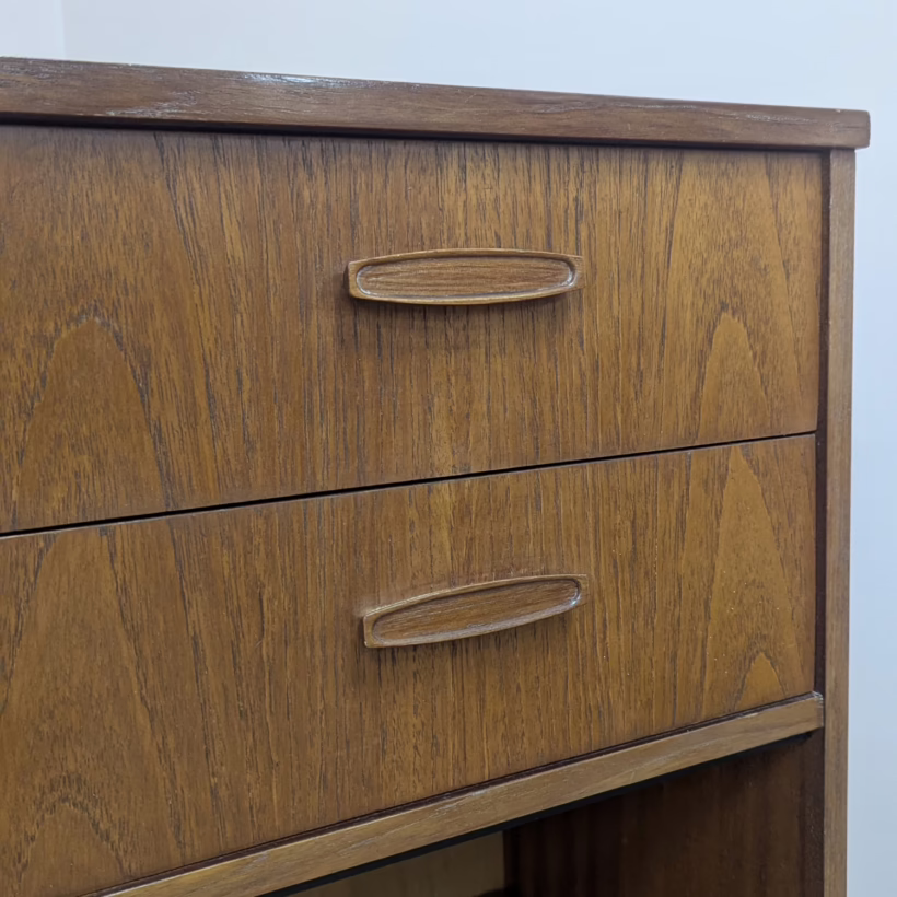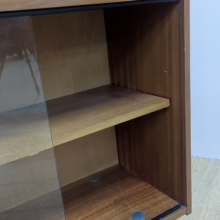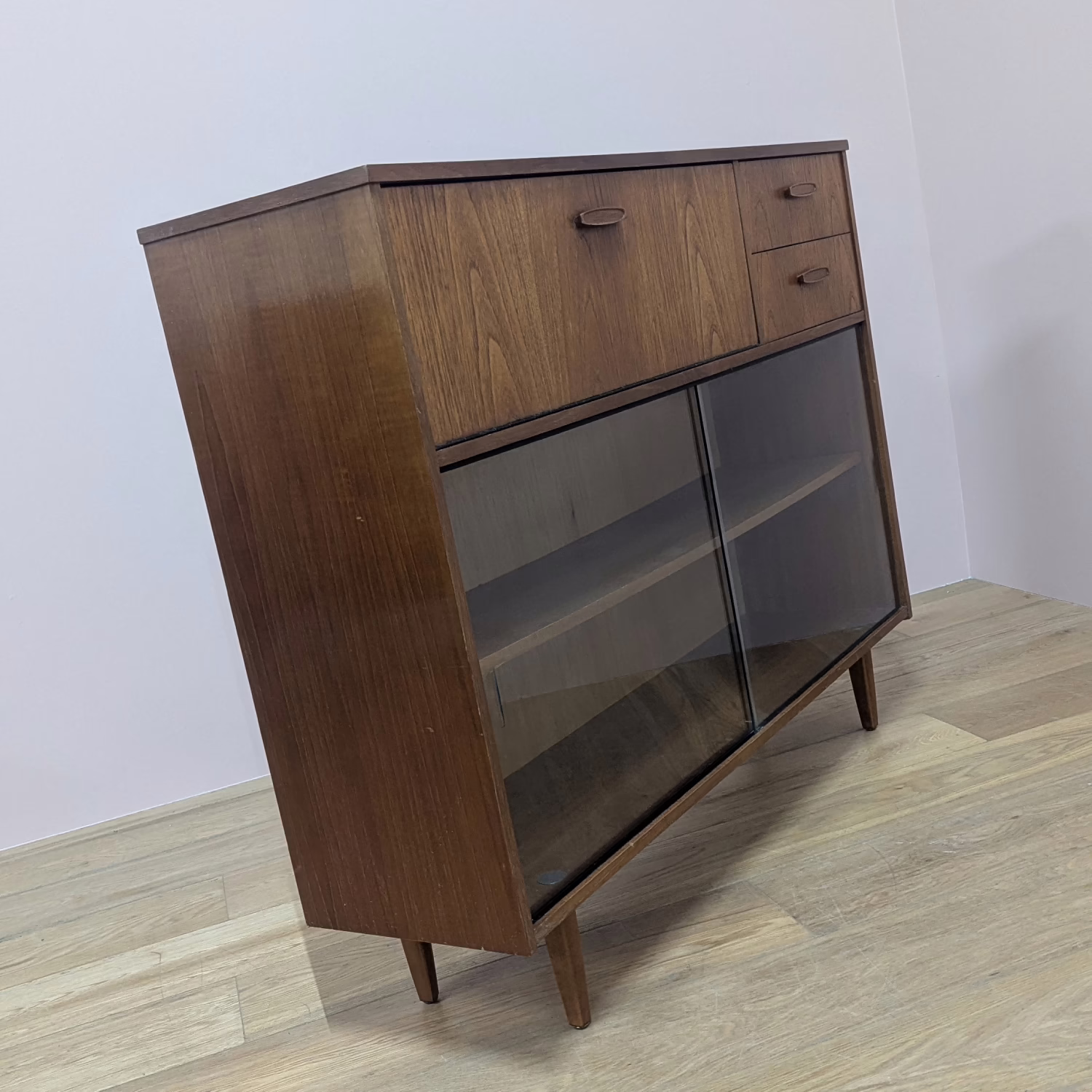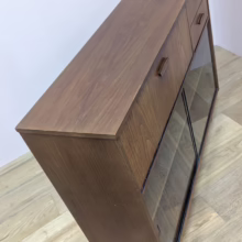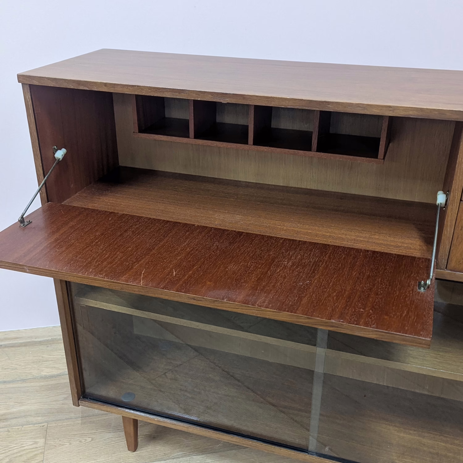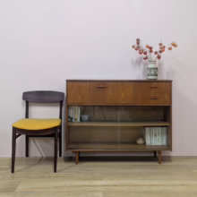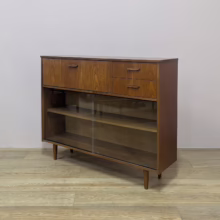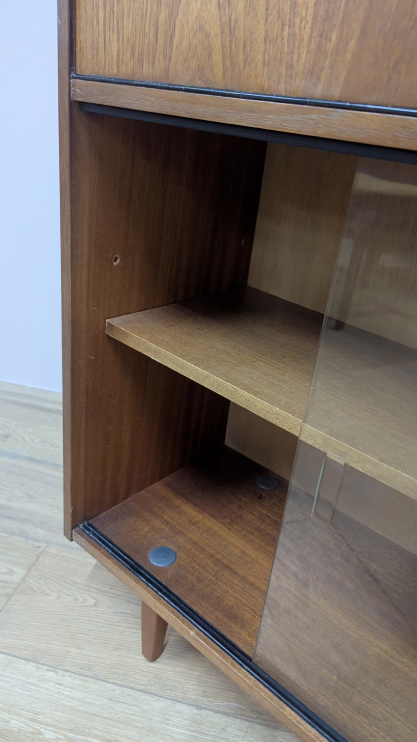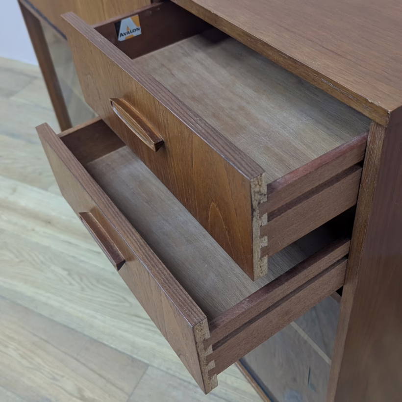 This is an original, vintage cabinet that ‘sold as seen’. It is in good – very good, used condition. We have thoroughly checked and cleaned this piece inside and out, reviving the wood with a natural beeswax polish but otherwise the finish is original. It’s in great order with just minor signs of wear and tear in line with its age. The lower glazed section features two glass doors which slide with ease in their runners. Inside there is an adjustable shelf and the interior is clean and tidy here. In the upper section there are two drawers and a small, fall-door bureau with further pigeonhole storage inside. Again, the interiors are in good, clean order with just light signs of use. All hinges and handles are securely attached and in good order too. It’s stable, solid and very well-made with no repairs or areas of concern. The Avalon maker’s mark can be seen inside the top drawer. Please browse our photos for an accurate account of this item. Any queries, do get in touch.