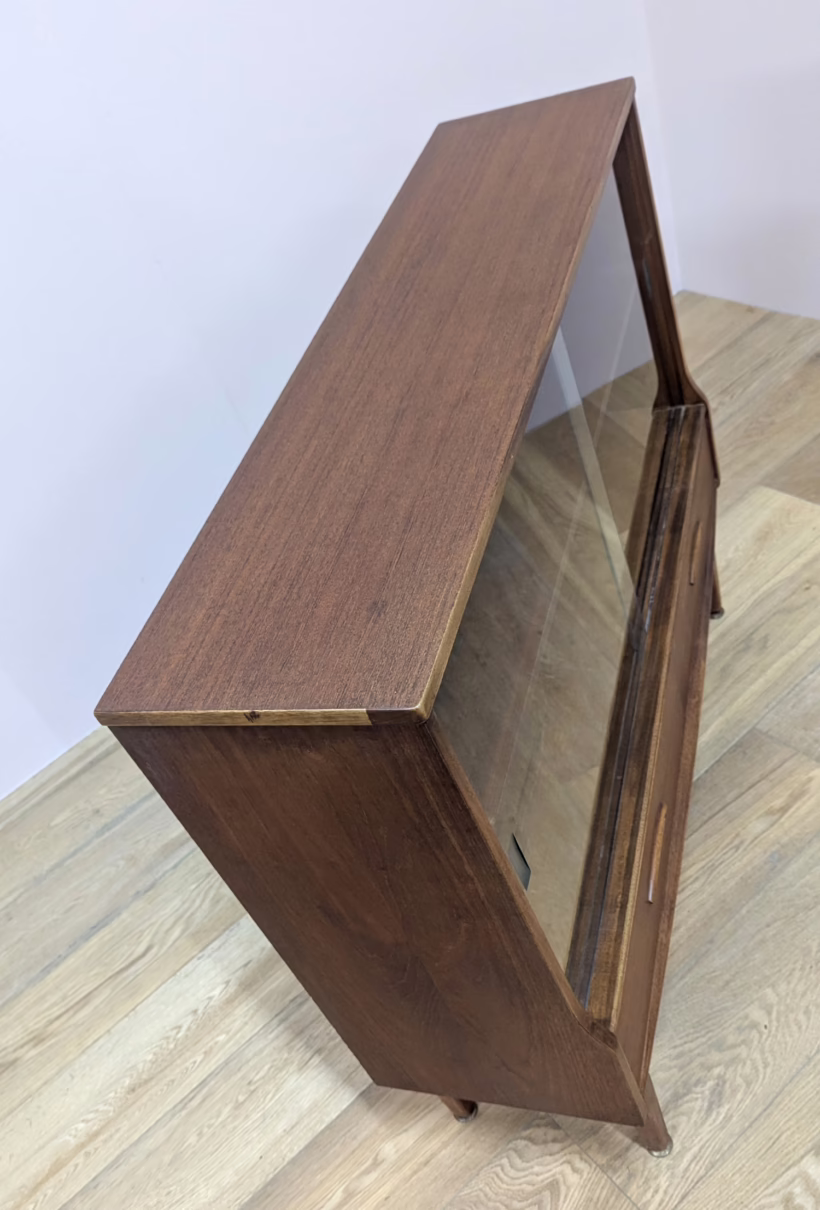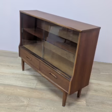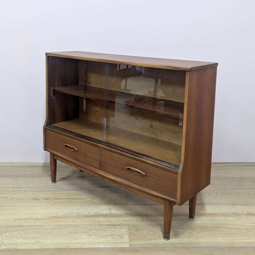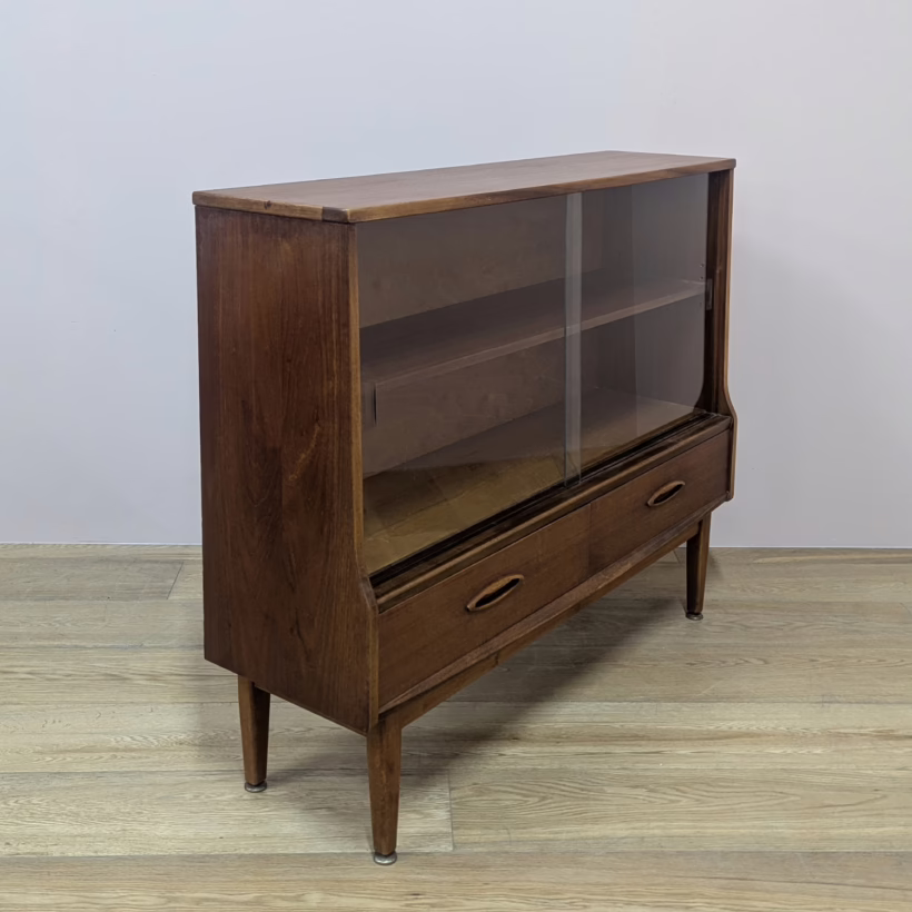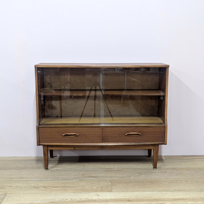This is an original, vintage cabinet that ‘sold as seen’. It is in very good, used condition. We have thoroughly checked and cleaned this piece inside and out, reviving the wood with a natural beeswax polish but otherwise the finish is original. It’s in great order with just minor signs of wear and tear in line with its age. The upper glazed section features two glass sliding doors which move with ease in their runners. Inside there is an adjustable shelf and the interior is clean and tidy. There are two small drawers below, very nicely made and again, clean inside. The cabinet sits on its original brass capped feet. It’s stable, solid, and well-made item with no repairs or areas of concern. There is no maker’s mark but we attribute it to Jentique with confidence as it’s a well-documented design that we’ve sold many time before. Please browse our photos for an accurate representation of this item. Any queries, do get in touch.