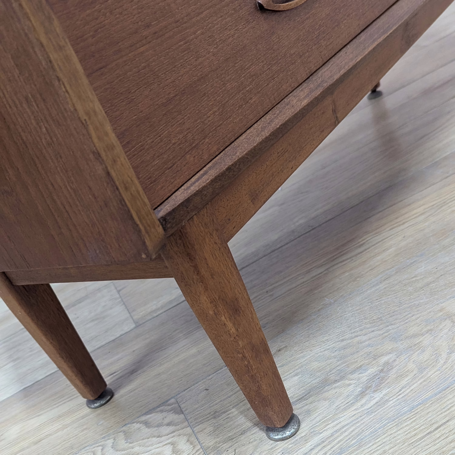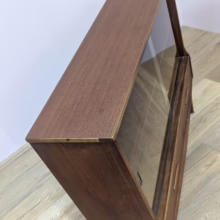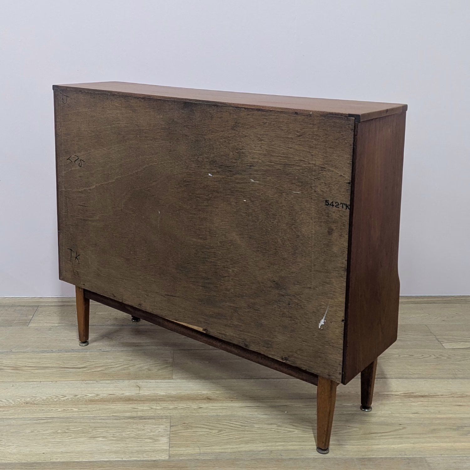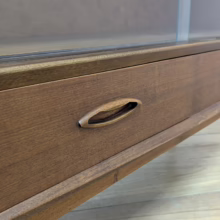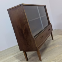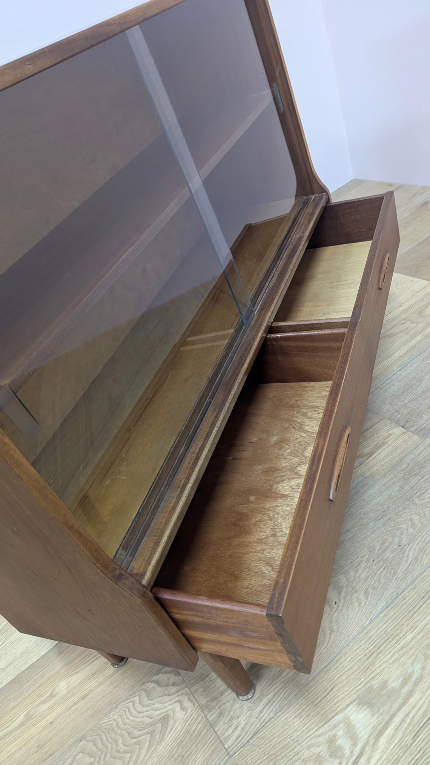 This is an original, vintage cabinet that ‘sold as seen’. It is in very good, used condition. We have thoroughly checked and cleaned this piece inside and out, reviving the wood with a natural beeswax polish but otherwise the finish is original. It’s in great order with just minor signs of wear and tear in line with its age. The upper glazed section features two glass sliding doors which move with ease in their runners. Inside there is an adjustable shelf and the interior is clean and tidy. There are two small drawers below, very nicely made and again, clean inside. The cabinet sits on its original brass capped feet. It’s stable, solid, and well-made item with no repairs or areas of concern. There is no maker’s mark but we attribute it to Jentique with confidence as it’s a well-documented design that we’ve sold many time before. Please browse our photos for an accurate representation of this item. Any queries, do get in touch.