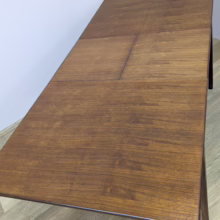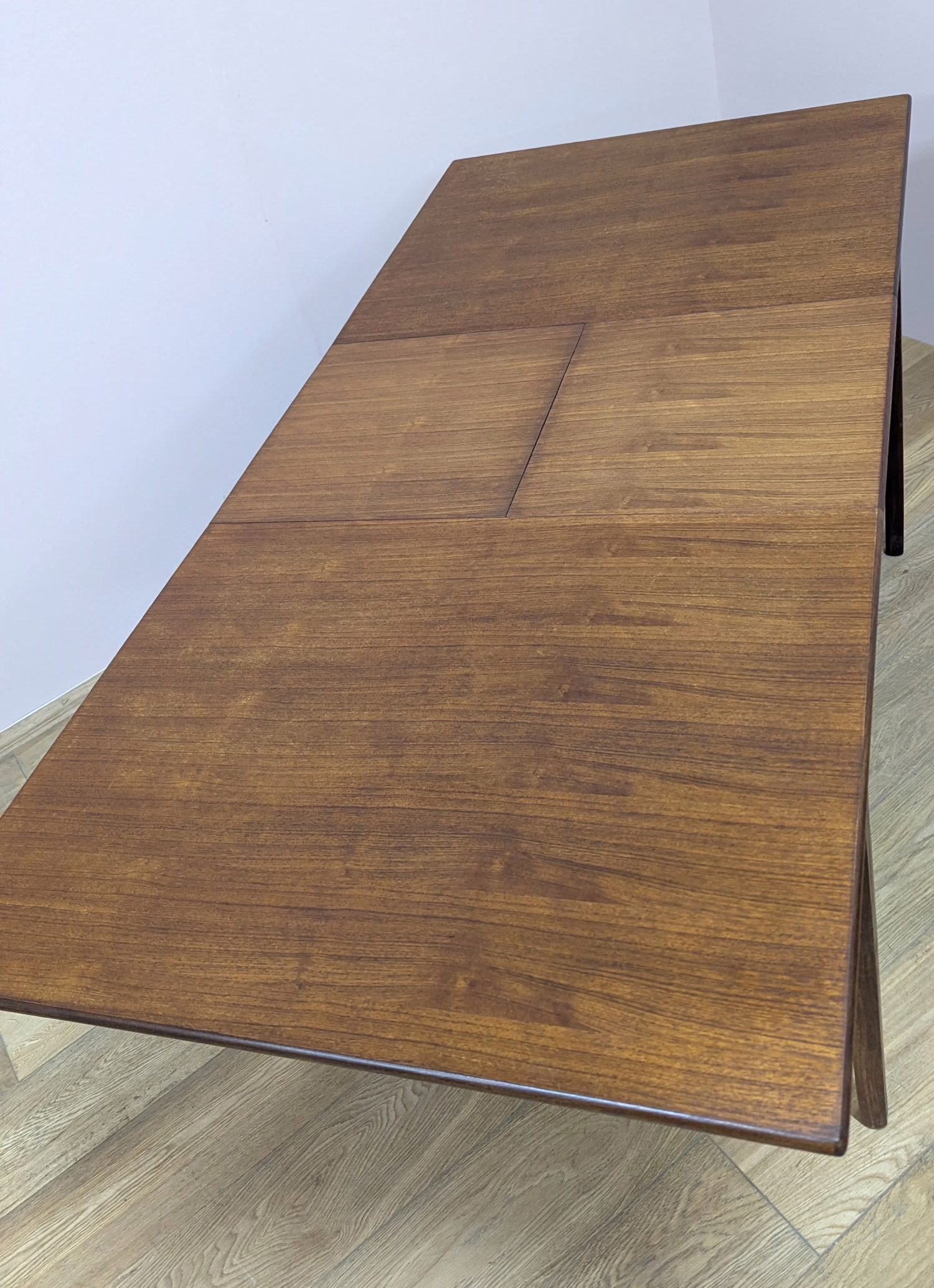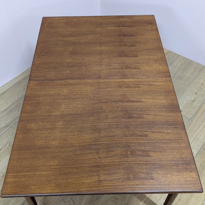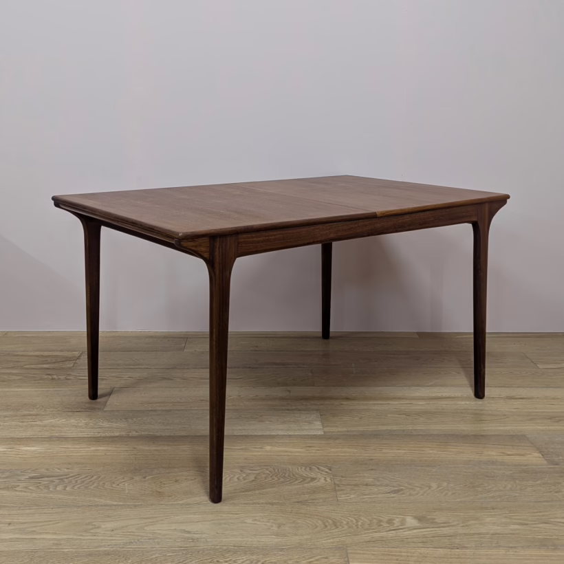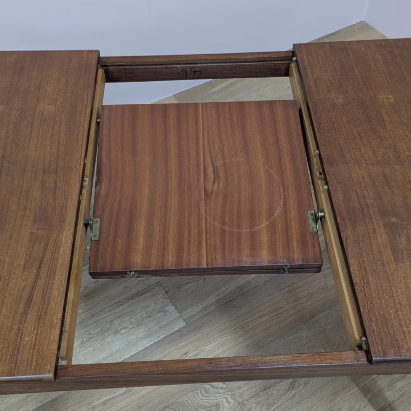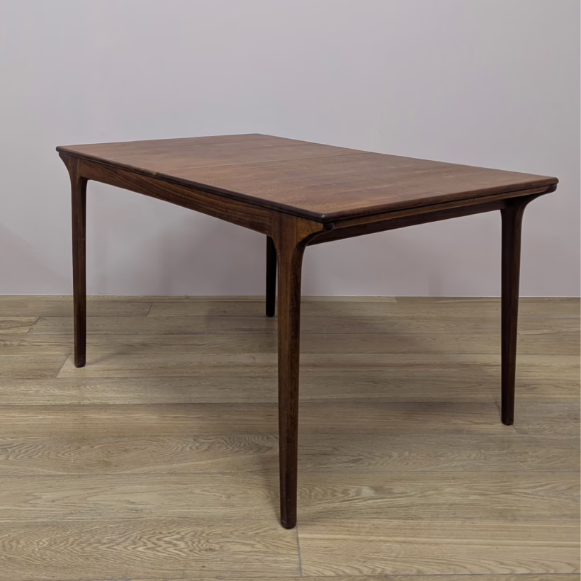 This is an original, vintage table that is ‘sold as seen’. It is in very good, used condition. We have thoroughly serviced this table and it has undergone a full restoration. This process involved carefully stripping away the original finish, followed by Osmo hard wax oil and polish for a durable finish. It’s in great refurbished order with just minor signs of wear and use. The table is extended by pulling apart the two sides to reveal the extra section integrated into the middle. This rotates, folds out and flattens into place and the two sizes are pushed back together for a seamless table top. All hinges and mechanisms are in very good working order. The table is stable and solid, a very well-made item with no repairs or areas of concern. There is no maker’s mark but we attribute it to McIntosh as it’s a well-documented design and the flattened outside edges of the legs are a signature feature of theirs. Please browse our photos for an accurate account of this item. Any queries, do get in touch.