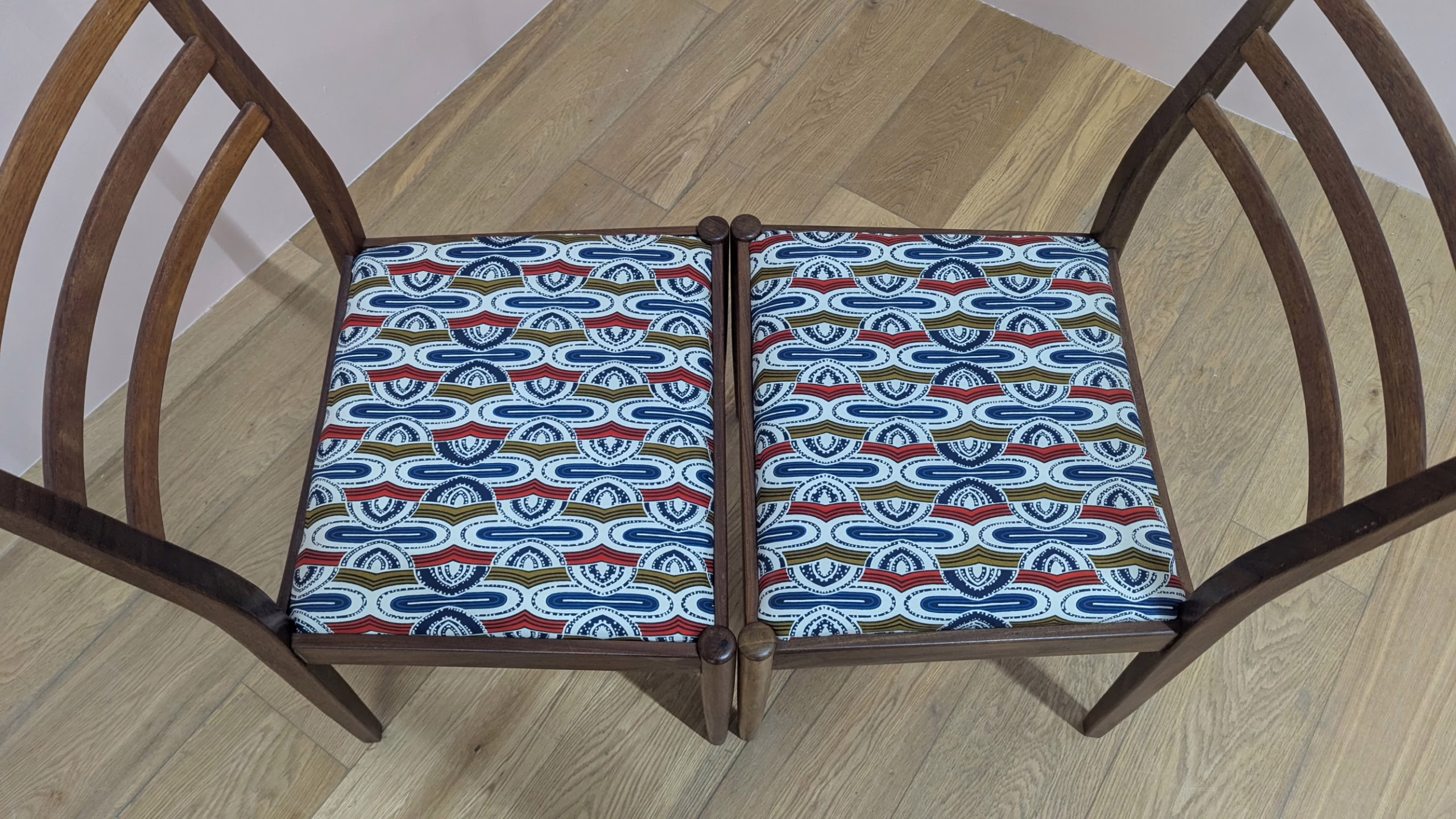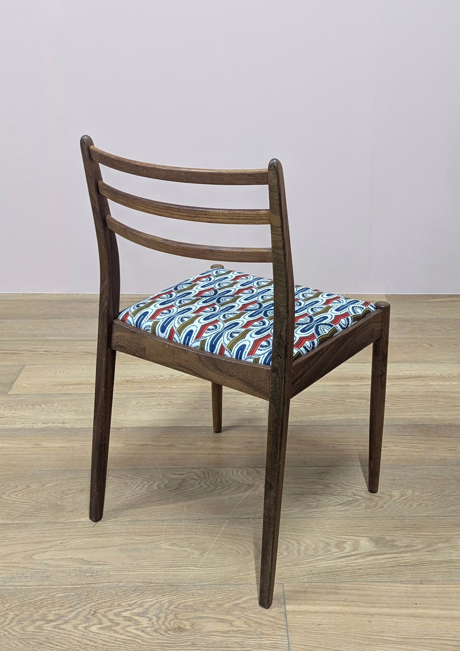This original, vintage pair of dining chairs is ‘sold as seen’. Overall, they are in very good, used condition. The solid teak chairs frames have been checked, cleaned and wax polished but otherwise the finish is original. They are in good – very good order overall with just minor, superficial scuffs and marks to the wood here and there. The seat pad upholstery is in very good order. We believe they have been recovered in recent times. The pattern is rather bold but recovering them to suit would be an easy and inexpensive job for the hobbyist or a professional upholsterer. The seat pads just drop in. Both chairs are solid and stable with no areas of concern. Do browse our images but any queries, please drop us a line or give a call.