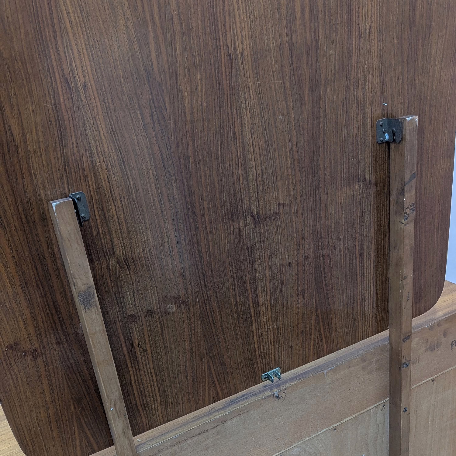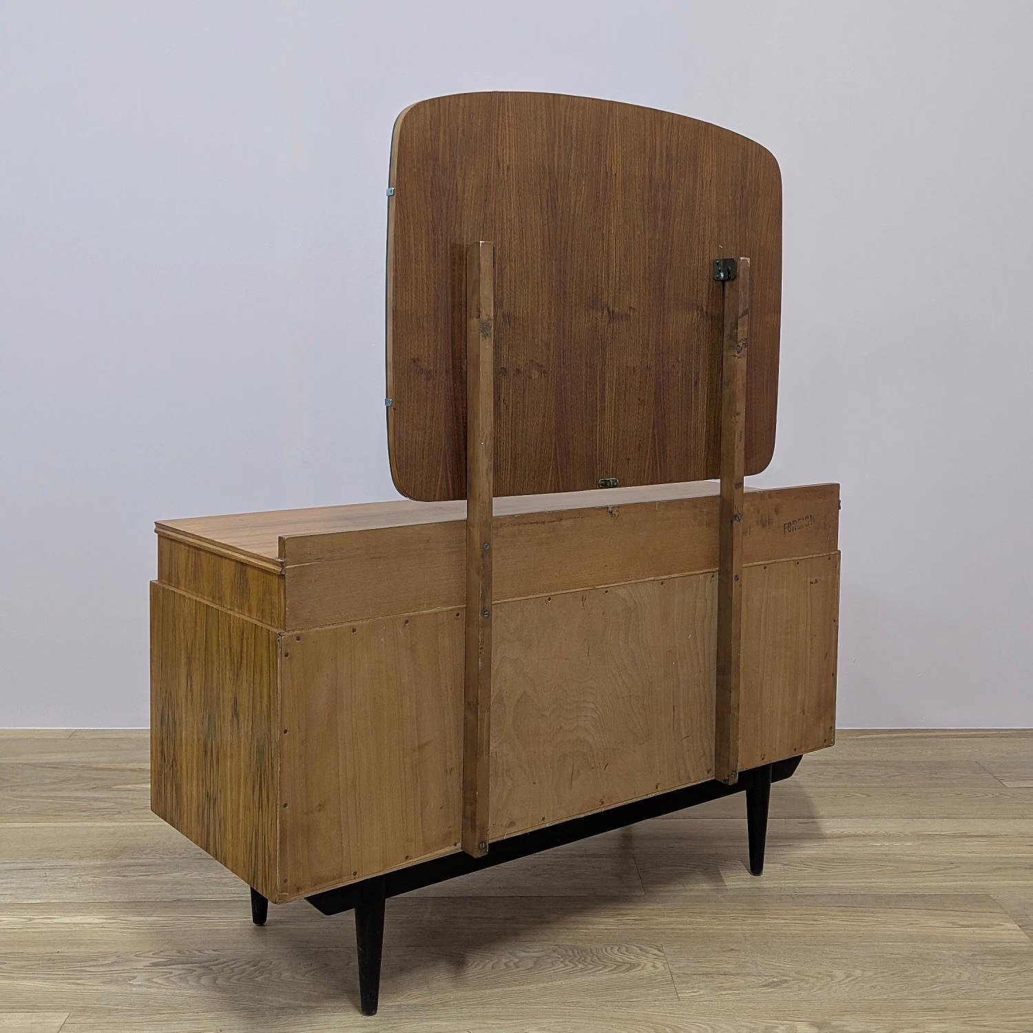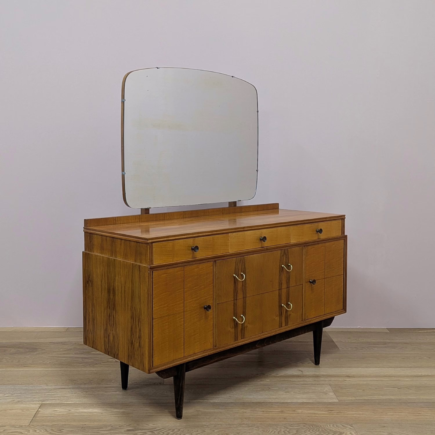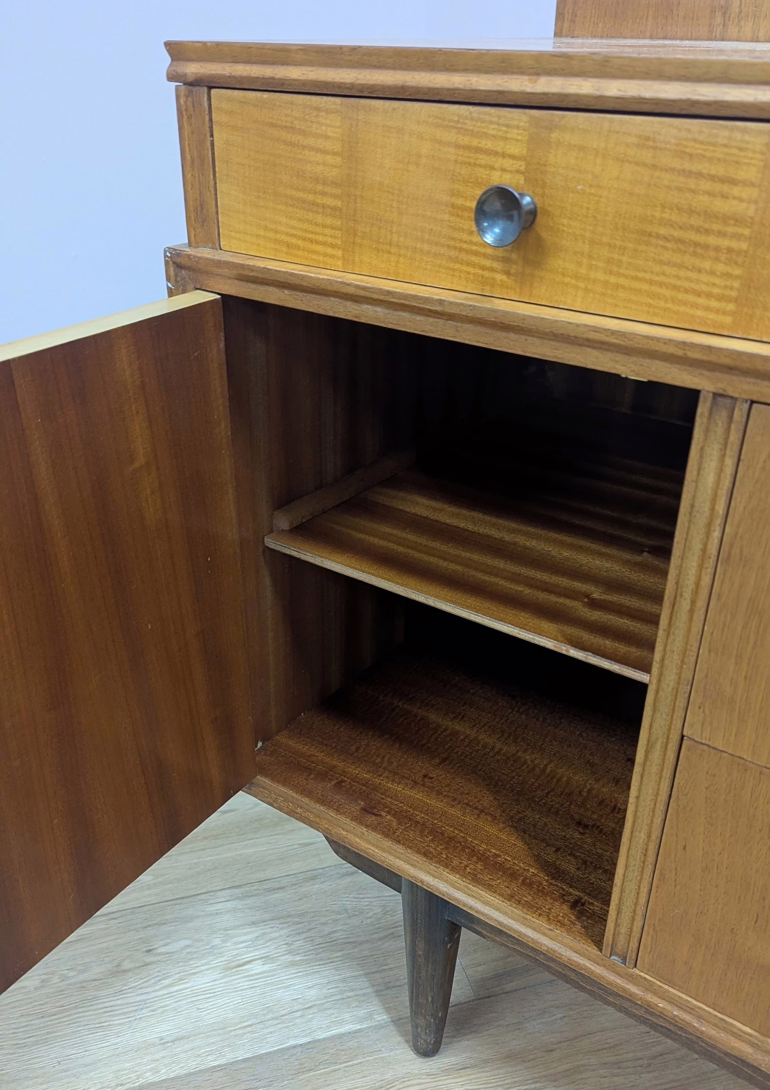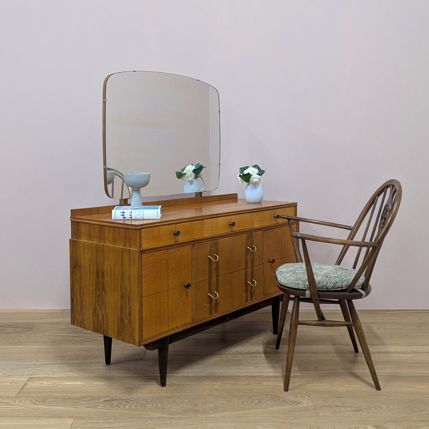 This is an original, vintage piece that is ‘sold as seen’. It is in overall good – very good, used condition. It has been checked and cleaned inside and out, and a natural beeswax polish applied to the exterior wood but otherwise the finish is original. It’s a expertly crafted piece in fantastic condition, given its considerable years -it’s date stamped ‘May 1960’ on the back. All five drawers (two large, deep central drawers and three slim, upper drawers) are in good, tidy order internally, with just minimal marks inside from use, and they slide with ease. They are well-made with dovetail joints and have securely attached, original metal handles. There are two further cupboards on each side, each with a fixed shelf inside. Again, the interiors are in good, clean order, with handles securely fixed and closures and hinges in good working order. The exterior wood is in good – very good condition with just a handful of very light scuffs and minor blemishes. These are primarily on the top surface, as you might expect but in the overall context of the piece they aren’t very noticeable at all. Please browse our photos. The large mirror hangs two uprights which screw in at the back. The lower hinged arm that’s usually at the base of the mirror at the back isn’t in place anymore so the mirror cannot be angled. The mirror itself is in good order with just very minor signs of ageing on the reflective surface. The mirror can be easily removed if you would like to use this piece as a sideboard – the mirror simply lifts off and the uprights are easily unscrewed. The chair and props shown are not included. Do look through our photos for an accurate account of this fine piece. It’s stable and solid with no areas of concern. Sadly we’ve been unable to definitively attribute it but it’s nonetheless an outstanding piece. Any questions, please don’t hesitate to ask.