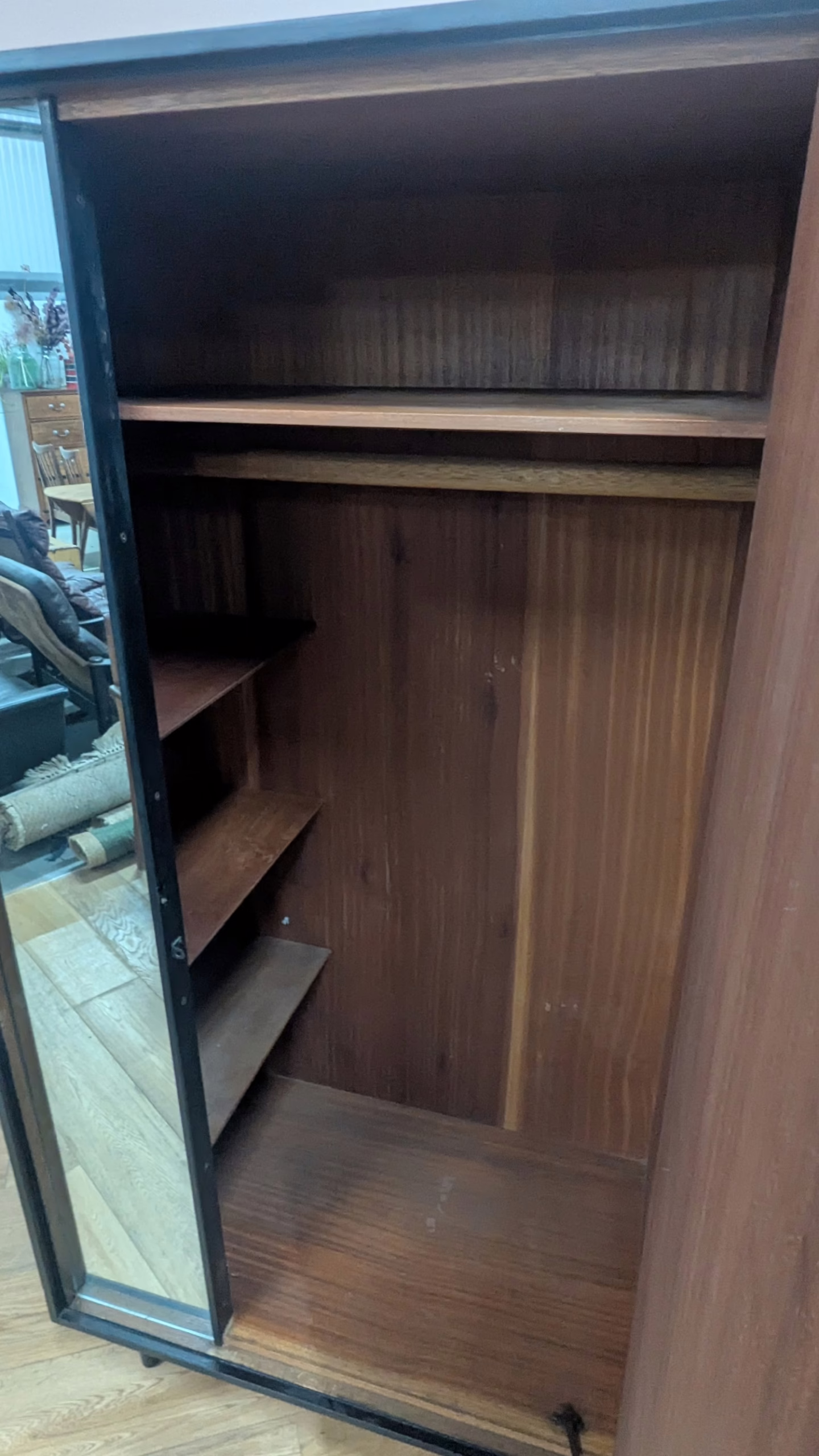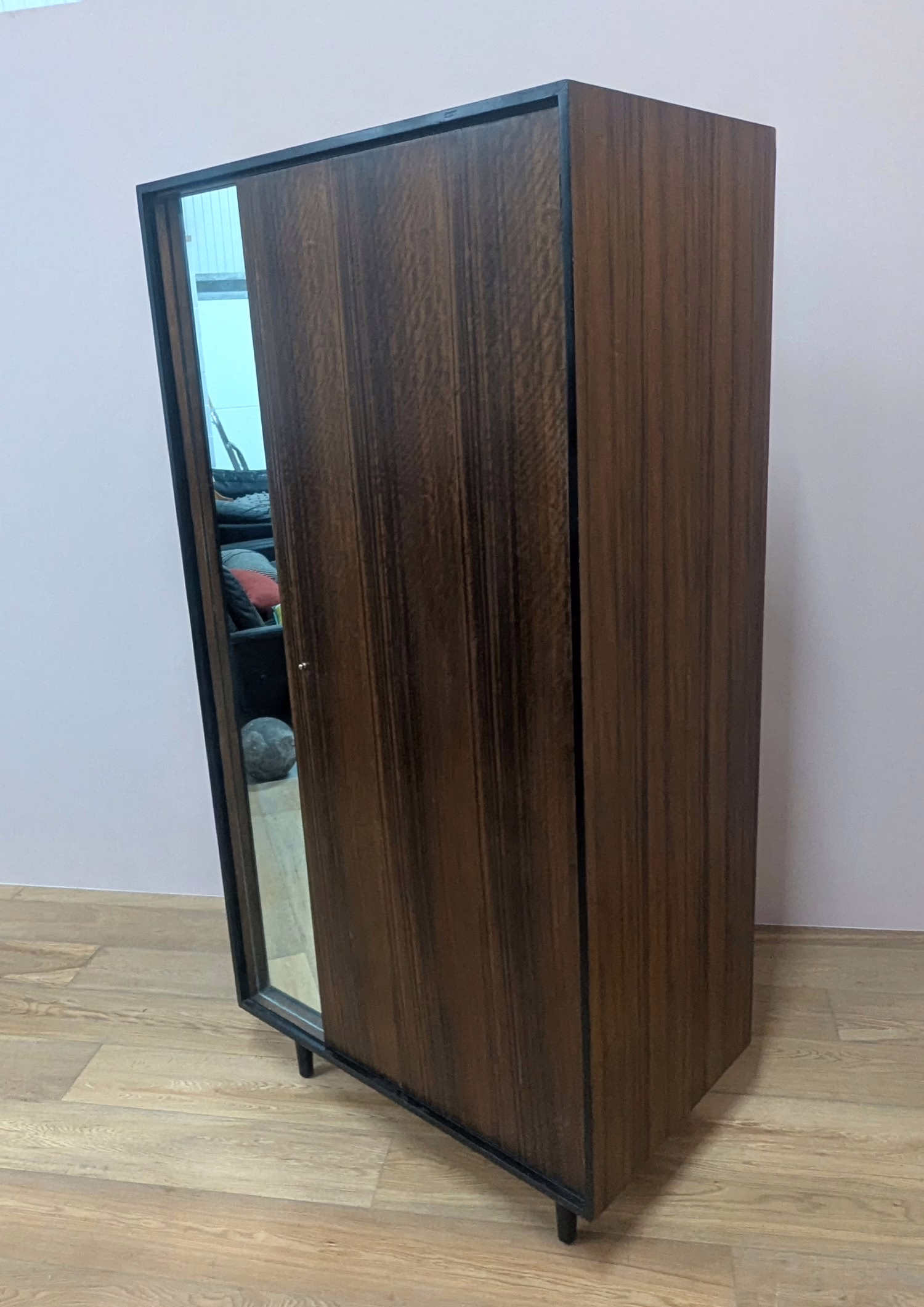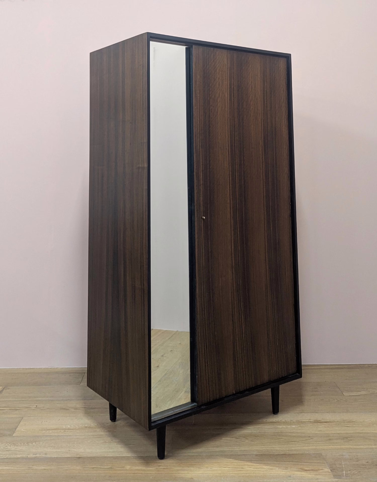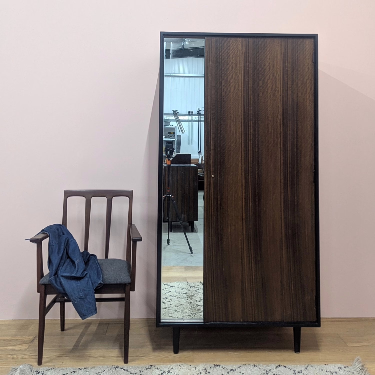 It’s not often we acquire wardrobes (mainly because of their weight!) but this one was too good to miss. Designed by power duo, John and Sylvia Reid for Stag in the 1950s, it’s from their highly regarded C range but in Australian walnut rather than the more commonly seen light oak. The rich, dark grain is so striking across its large expansive exterior surfaces. The grain is sublime. The overall design is refined, clean-lined and minimalist, looking both vintage and contemporary at the same time. We love the black border framing the front, a subtle accent of distinction and there’s plentiful storage inside with a rail and fixed shelves / cubby holes to the left. This is a super piece of timeless, midcentury design with great provenance that will mix and match with other furniture. We have an accompanying chest of drawers. If you are interested the pair, please get in touch for a discounted price.
