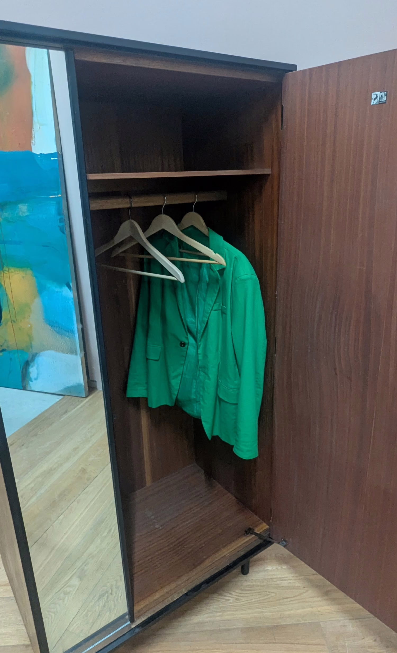 This is an original, vintage piece that is ‘sold as seen’. It is in good – very good, used condition. We have serviced and cleaned the wardrobe inside and out, and exterior surfaces have been thoughtfully restored. This involved carefully stripping back the original finish, followed by oil and then wax polish to restore it to its former glory. The wardrobe interior features a full-width fixed shelf at the top, four fixed cubby hole shelves and a hanging rail. The hanging rail is a little scarred with use but perfectly functional – please see our photo. The interior is in good, clean and tidy order with light signs of use, as shown. The door opens with a discreet, brass push button and then you pull to open. The closure and hinges are in very good, working order. The exterior surfaces are in very good order, following their restoration, but there are very light signs of wear and tear in line with the item’s considerable age and as you would expect. It’s a well-made, solid and sturdy piece. The Stag label is both inside and on the back of the piece. Do browse our photos for a good sense of the piece. Should you have any queries, please do ask.