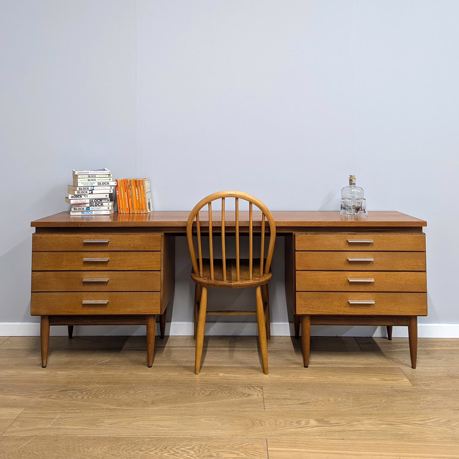 A seldom seen piece from British midcentury furniture maker, White & Newton, this long desk was part of a short-production range designed by Arthur Edwards and it dates from the early sixties. It was formally a vanity table but the mirror that once screwed to the back is long gone, as is often the way. No matter though because it serves just as well as a very handsome, wide but shallow-in-depth, pedestal desk. Ideal for someone who works from a laptop which increasingly is most people in their home setting. It comes with a generous leg area to tuck in a chair and there are six drawers in total so plentiful store space. The design is classic MCM with crisp lines and sharp angles accentuated by the shadow gap detail across the drawer fronts and the minimalist steel handles.