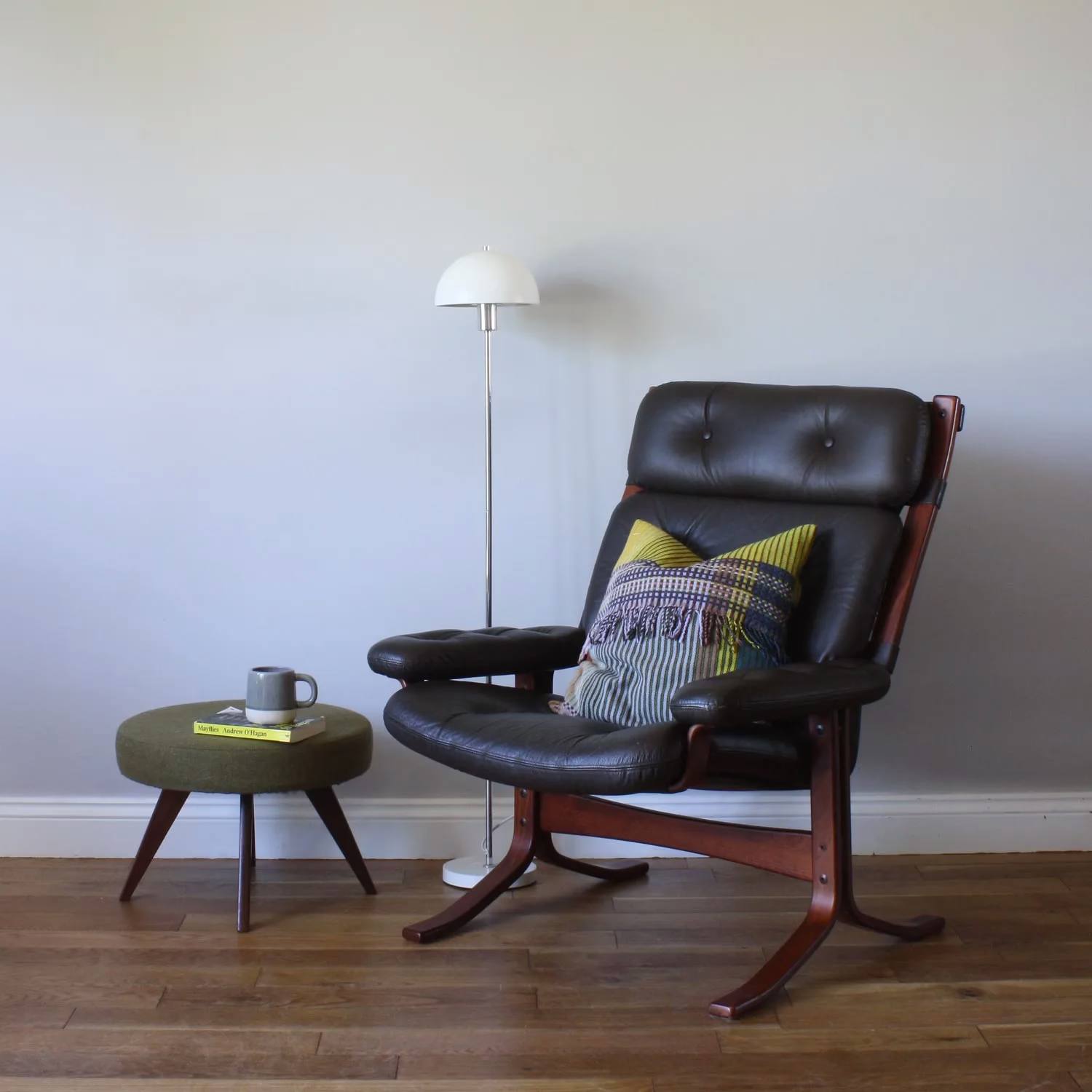 This midcentury bentwood leather lounge chair has had us scratching our heads. It’s such a statement design and its construction and materials are of the highest quality… and yet we’ve failed to attribute it. The maker’s mark is long gone but we simply can’t find anything with that unusual leather belt strap design across its back. The back is as interesting and as handsome as the front in our view, with some fantastic details like the belt strap and the toggles. Don’t stick this chair in the corner! It should be enjoyed from all sides. It’s not just about the looks though, this is really comfy from the tall, contoured back providing maximum support to the soft, thick leather cushions to the generous seat depth and width to the plump arm rests.