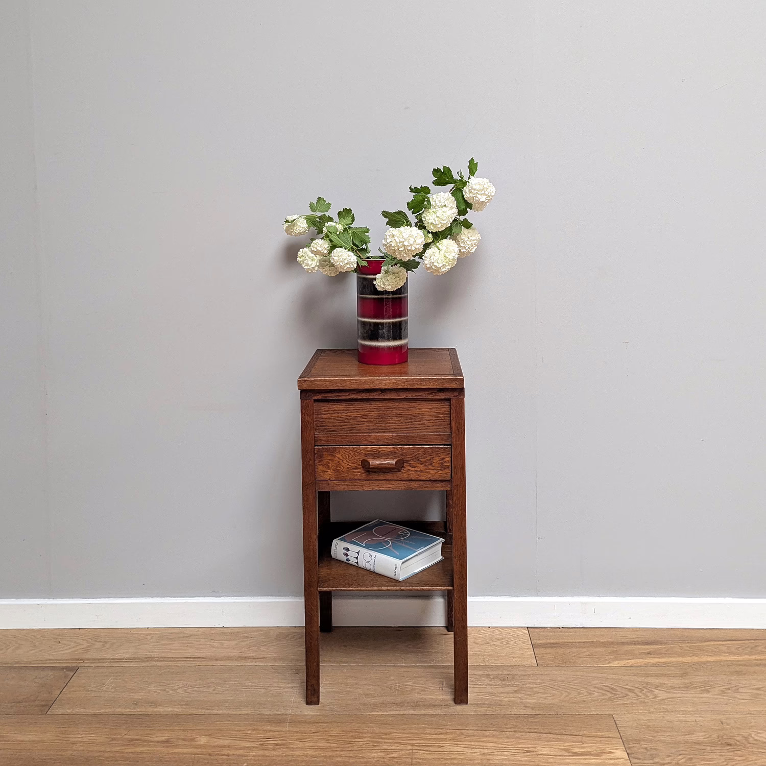 At a glance, it looks like a regular vintage nightstand or occasional side table but this was meant for ribbons, spools of thread, embroidery silks and pin cushions. This oak sewing table is an old-fashioned darling. Sitting on long legs to slot neatly beside a favourite chair, there is a lower shelf, a small sectioned drawer and the table top is hinged for further storage inside. Nicely and simply crafted, it can of course serve just as well as a nightstand or occasional table. A super, characterful piece.