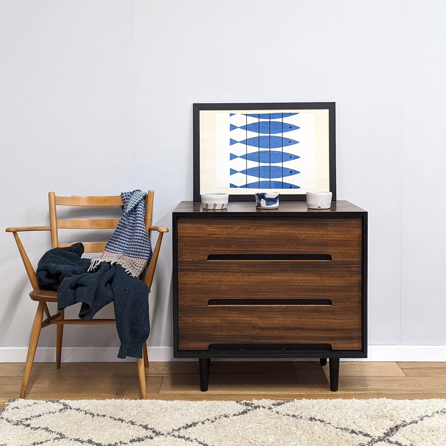 This is one of those pieces that looks both midcentury and contemporary – and that’s classic, timeless design. Designed by power couple, John and Sylvia Reid for Stag in the 1950s, this is from their C range. The Australian walnut makes a refreshing change from teak and the rich, dark grain is striking across the exterior surfaces. The overall design is refined, clean-lined and minimalist with long, lower recessed handles. We love the black trim framing the front, echoed in the drawer handle insets and tapered legs. It creates a subtle note of distinction. Plentiful storage across three generous drawers, a lovely slice of midcentury with great provenance that will mix and match with other furniture.