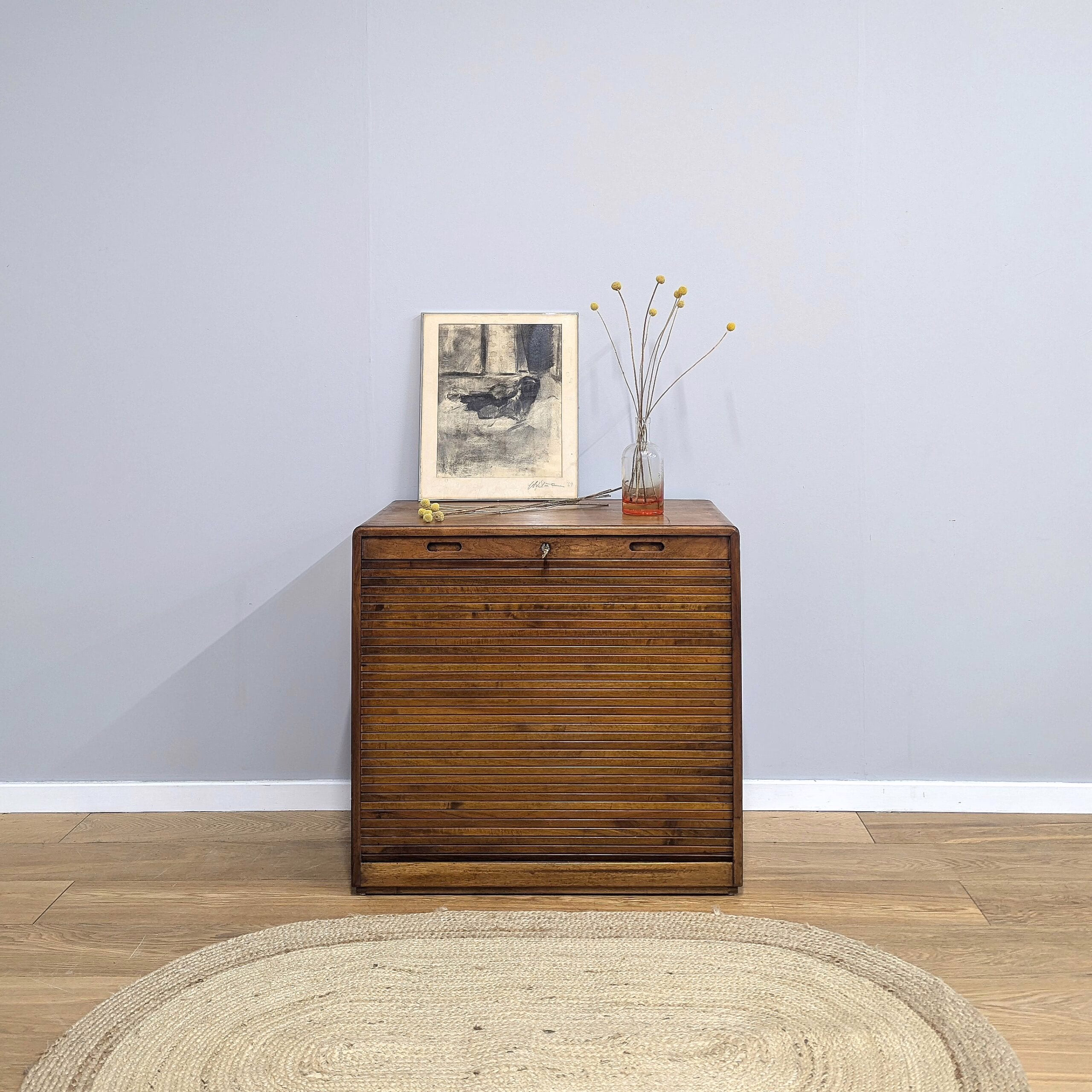 There’s something magical about the roll of a tambour door. This vintage cabinet dates from the 1950s and originates from Sweden. Made by Åtvidabergs, who primarily specialised in office furniture, this would have originally been used in an office / workplace environment. In its later years, it was turned upside down (the lock that keeps the tambour door closed had broken – it’s now been replaced with a new working lock as part of our restoration), covered with Formica and used for tool storage in a workshop! We’ve restored it back to what it was but left some of its narrative behind in the blemishes and scars across its surfaces. The tambour door opens to reveal a bank of six removable tray drawers on one side and a further large drawer and open cupboard on the other. It doesn’t get more characterful and endearing than an old, vintage piece like this. Wherever it goes in whichever room, it will charm and find a purpose.
