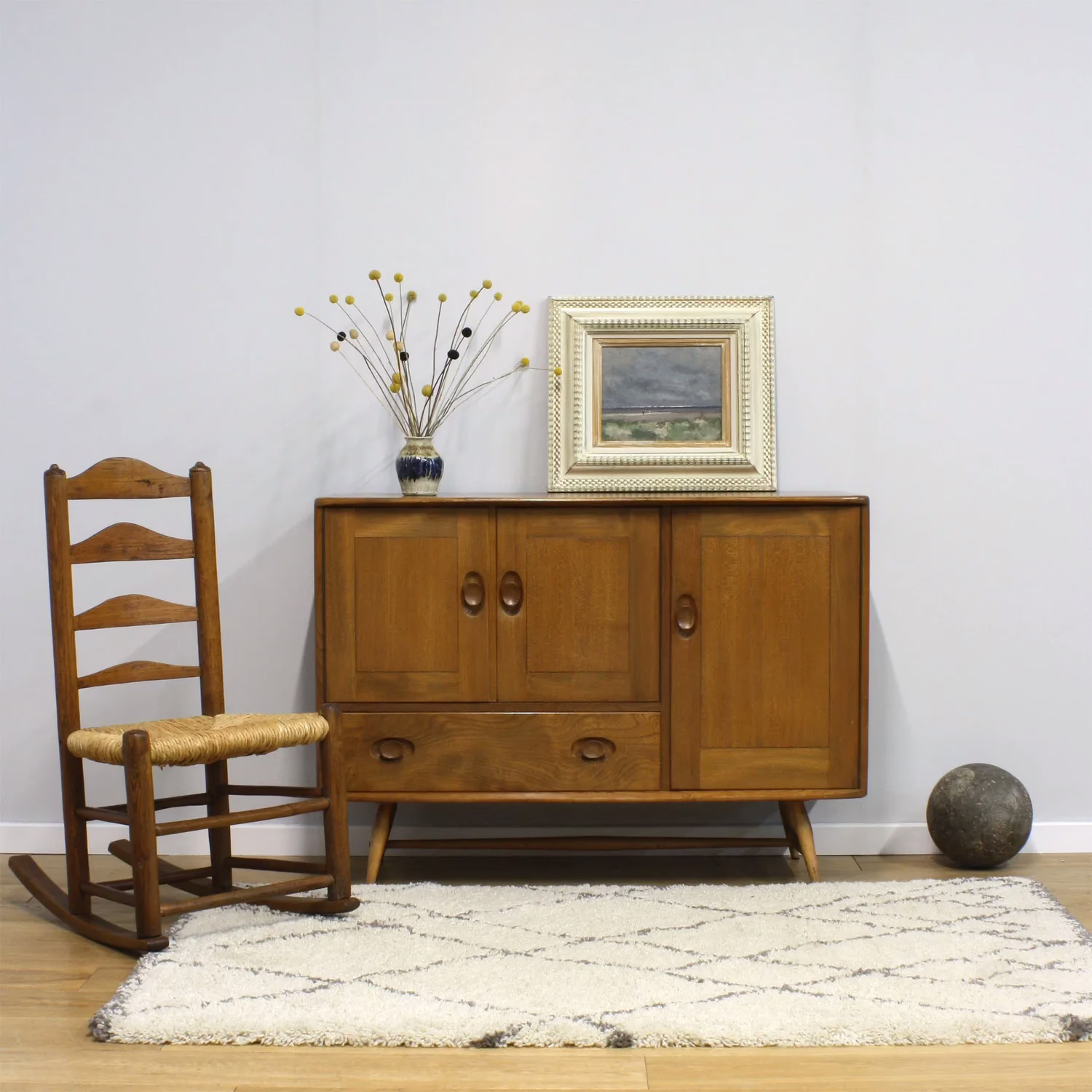 These early Ercol sideboards have such character. It’s not hard to imagine a 1960’s modern home with a nuclear family bustling around this classic piece of retro furniture. This rare model, in super original condition, is much sought after with its neat proportion and its splayed beech legs which give it a lighter, less bulky look than later Ercol sideboards. It was designed in 1962 and produced up to 1970 so this old dame comes with heritage and history. The cupboard and drawer fronts have a flatter / flusher design. Considering its years and purpose, it’s in great order, a testament to Ercol’s fantastic craftsmanship and the hard-wearing solid wood construction. The cabinet is made from solid English elm with Ercol’s signature exposed dovetail joints and those Windsor design oval handles. Each cupboard has a full width, adjustable shelf and the right cupboard has a removable butler’s cutlery drawer with dividers. Such a practical piece of design offering lots of storage, it’s as useful today as it was back in that 1960’s family home.