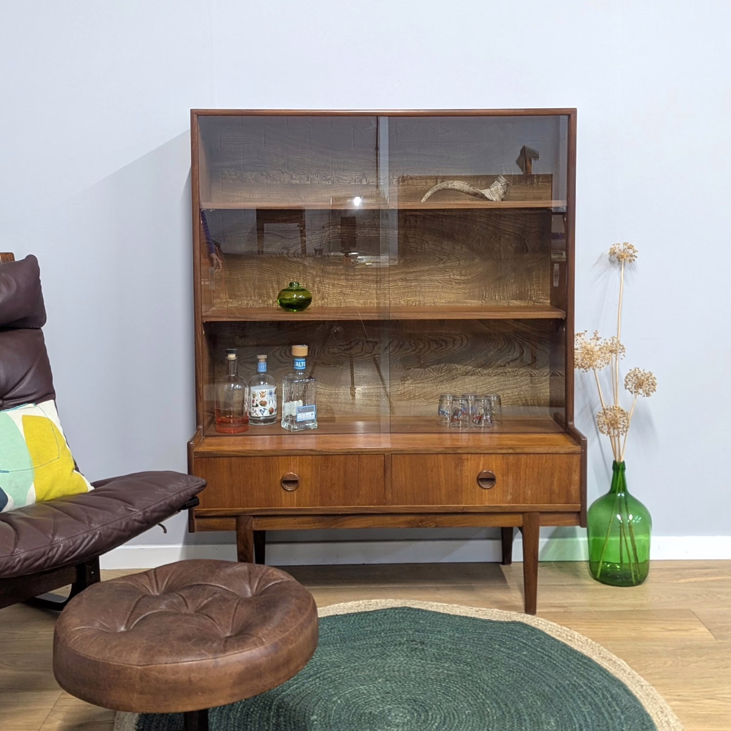 Made by British manufacturer, Turnidge of London, in the early 1970s, this is a practical, freestanding piece. Tall and shallow, it will tuck into a nook or alcove with ease and it’s the perfect cabinet for showcasing precious treasures and books with a large glazed top section that has adjustable shelves inside. Down below are two drawers for hidden storage featuring Turnidge’s signature recessed round handles. A really well-made piece that’s got masses of vintage charm but this doesn’t necessarily mean it needs to find a midcentury-themed home. Its design and wood tone is actually fairly neutral and unassuming so it will slot in alongside older or more modern furniture.